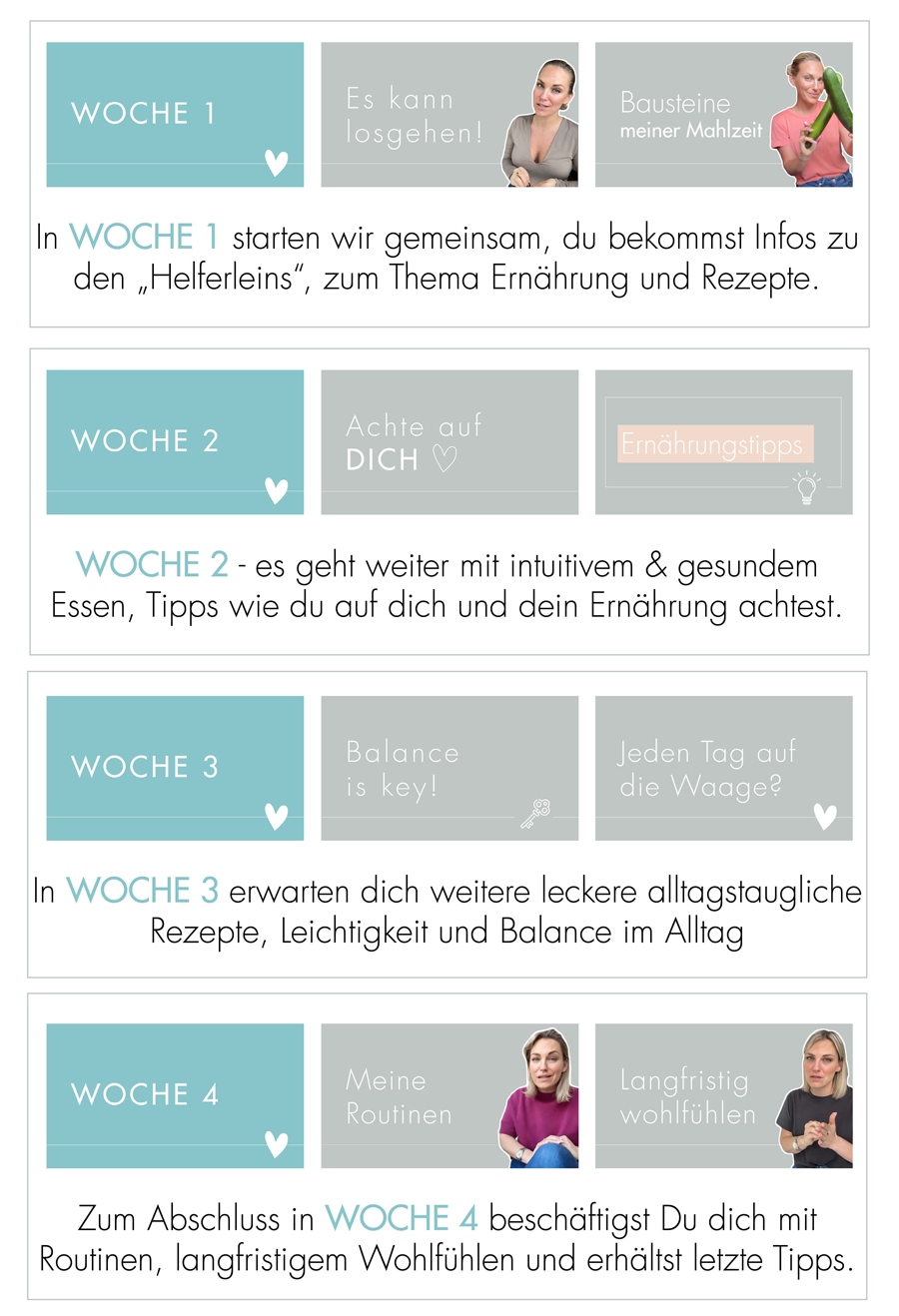 Jede Woche gibt es neue Lektionen, du verinnerlichst gesunde Routinen NEUES Körpergefühl, Healthy Basics.