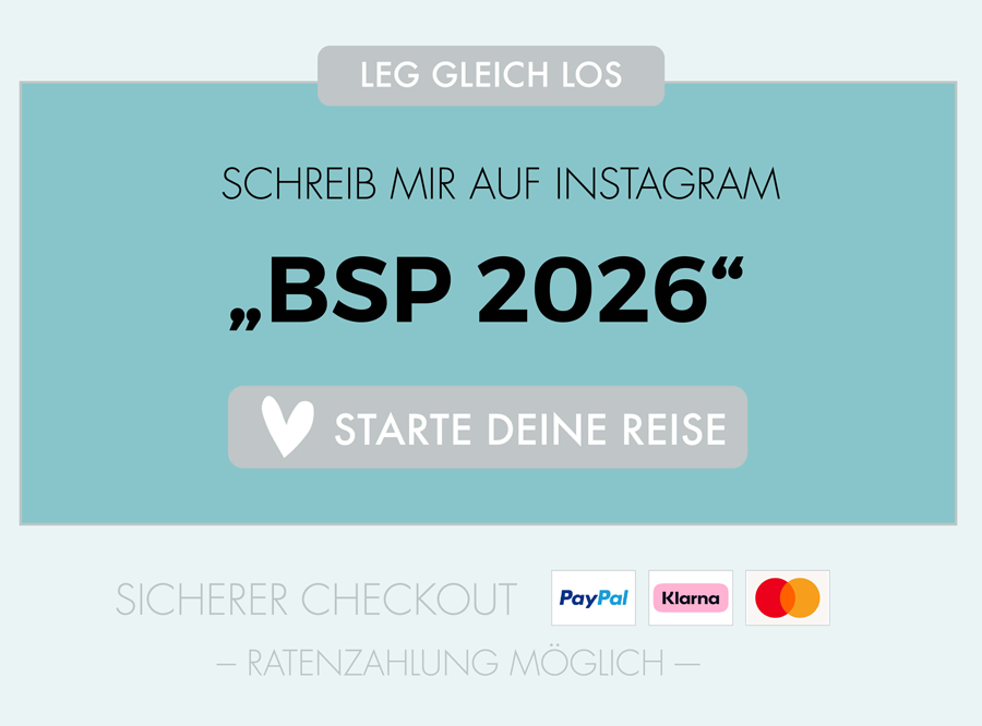 Um den Kurs zu buchen schreib eine Nachricht auf Instagram mit „BSP 2026″, nach Abwicklung der Zahlung werden dir die Produkte versandt und der Kurs dir über Mentortools freigeschalten.:)